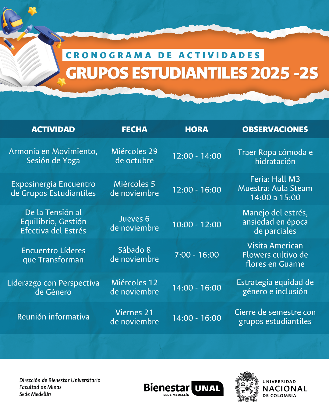 ¡Hoy inician las actividades del semestre 2025-2S para todos los grupos estudiantiles UNAL! Infórmate y participa en una agenda para tu despegar tu bienestar y liderazgo.