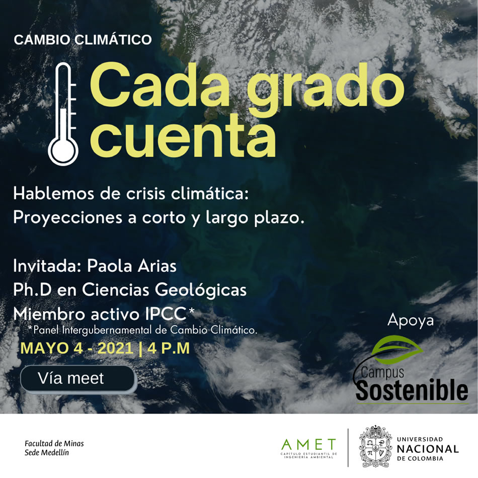 El Grupo Estudiantil AMET (Capítulo de Ingeniería Ambiental) quiere poner sobre la mesa la discusión sobre el cambio climático, motivados por el Climate Students Movement, del que hacen parte; invitan a la comunidad universitaria a la conferencia "Cada grado cuenta", presentada por la profesora de la UdeA Paola Arias, miembro del IPCC; quien hablará sobre las implicaciones del cambio climático a corto y largo plazo desde un contexto regional.La cita es el 4 de mayo a las 4:00 p.m.